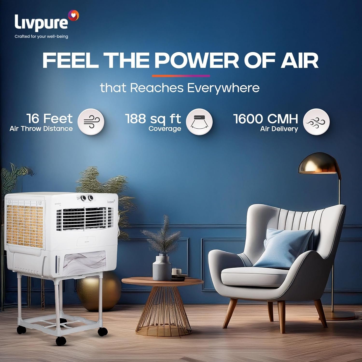 - At amazon.in you can purchase Livpure GoodAir Window 52L Air Cooler | 188 Sq. Ft. Area Coverage| 190 Watt Motor with Overload Protection |Inverter Compatible|Woodwool Cooling Pads |2 Yrs Motor Warranty & 1 Yr Comprehensive (White) for only ₹ 5,799 , which is 23% less than the cost in croma (₹ 7,490).