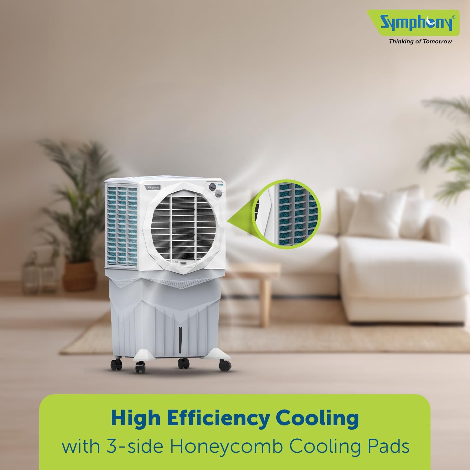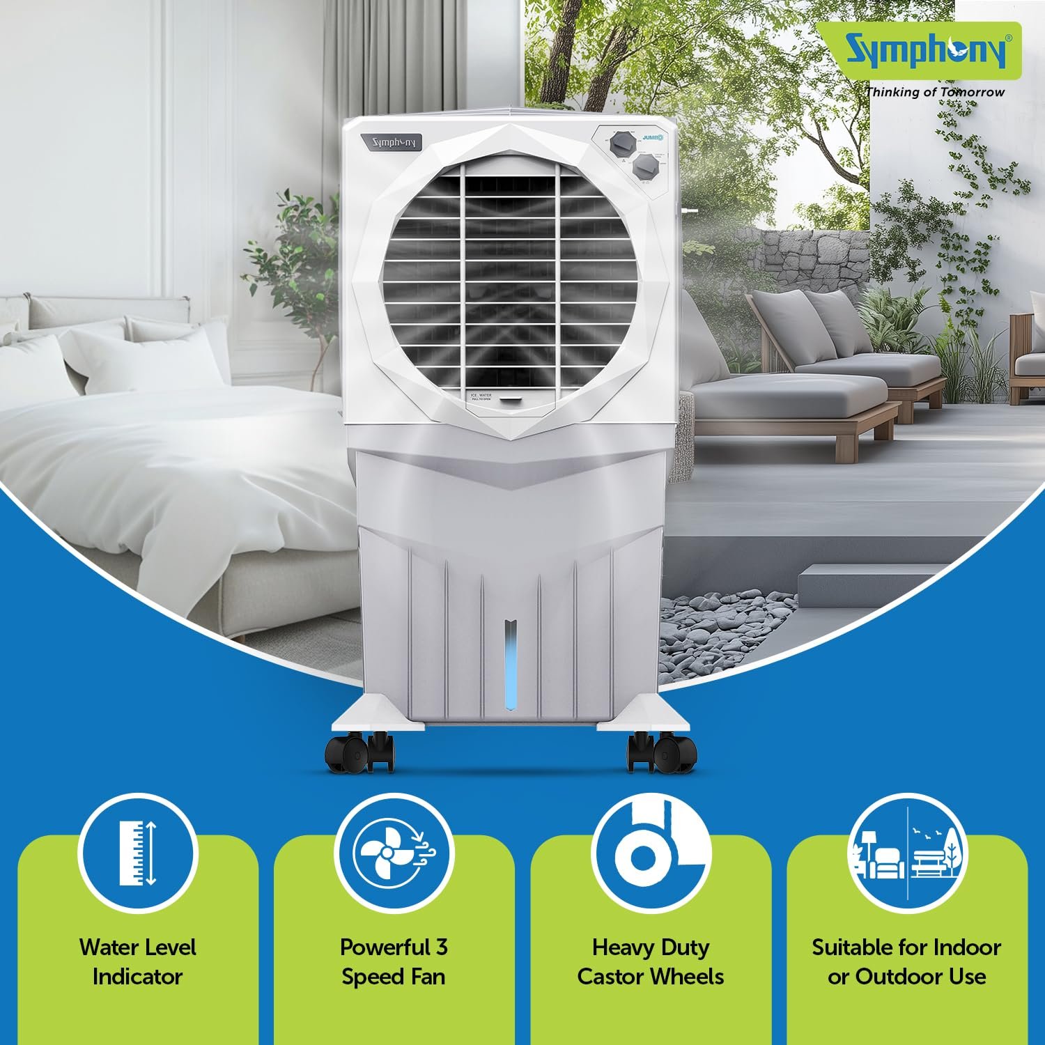 Symphony Jumbo 75XL+ Desert Air Cooler | 3-Side Honeycomb Pads | Powerful Fan | Auto Louver Movement | CFD Technology | 75L | 1-Year Warranty